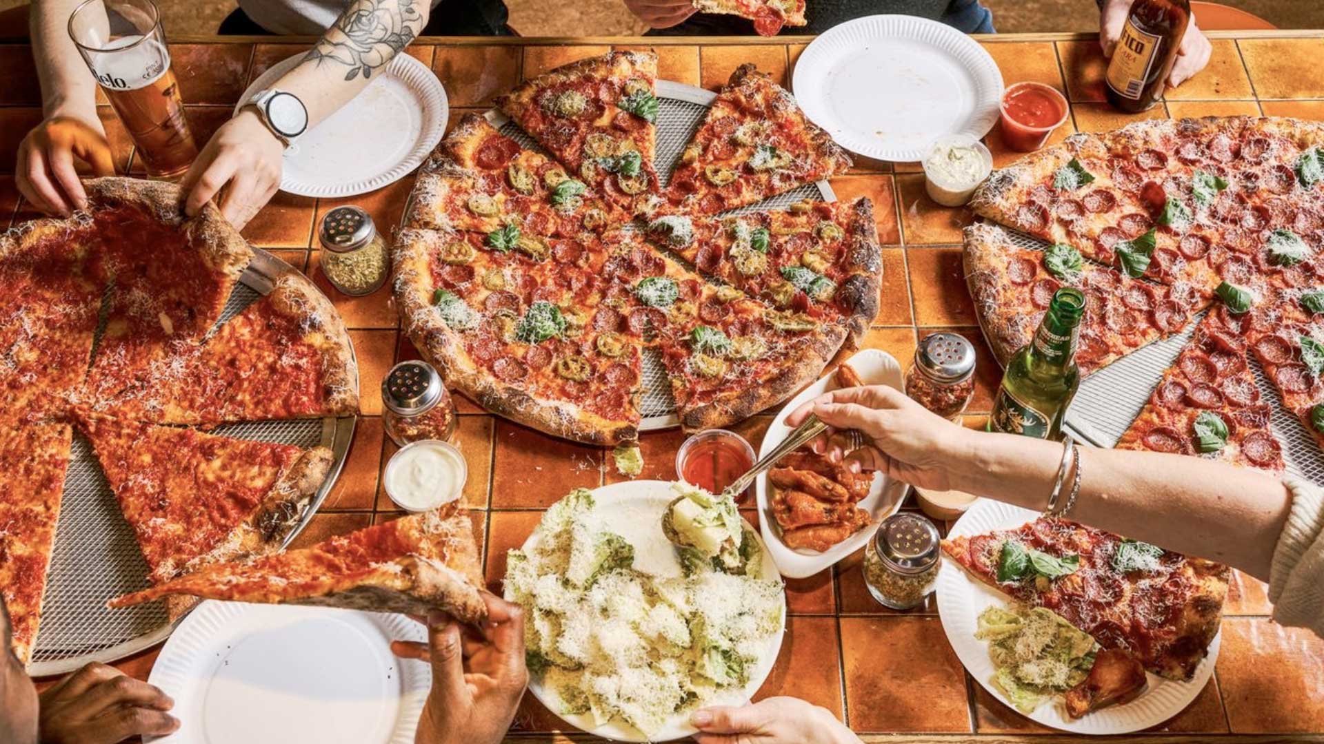 Huge crispy slices. Cheese, more cheese and a red sauce with real depth. Vodka & Sausage, Pepperoni, Burrata – all the classics. Every slice hits hard. All the good stuff, legit. Fuhgeddaboudit.